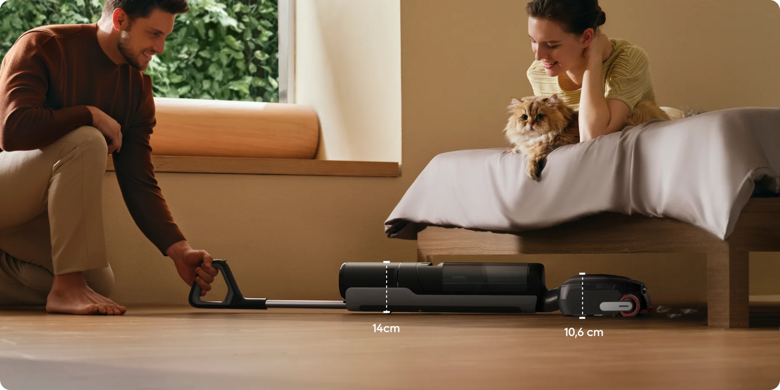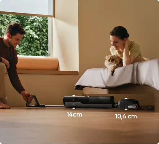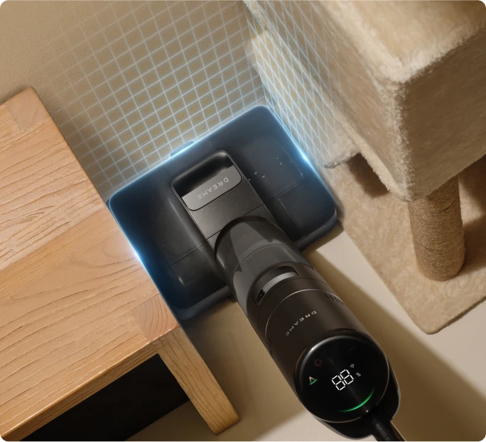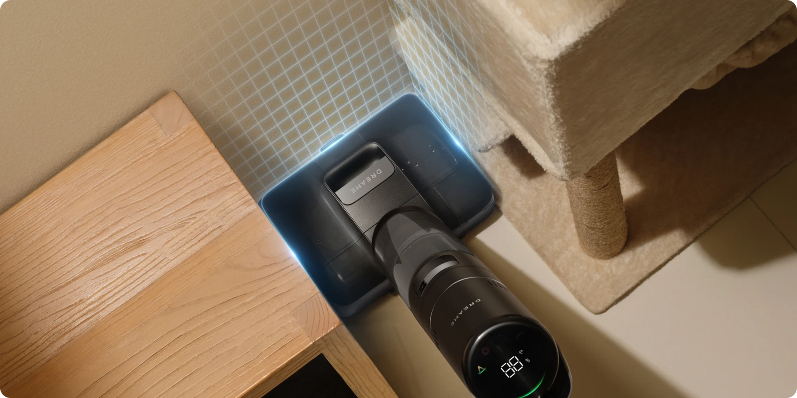 H15 Pro FoamWash reagisce mentre ti muovi: il suo braccio robotico con IA si abbassa in soli 0,2 secondi, garantendo una pulizia dei bordi su tre lati precisa senza tralasciare alcun punto.