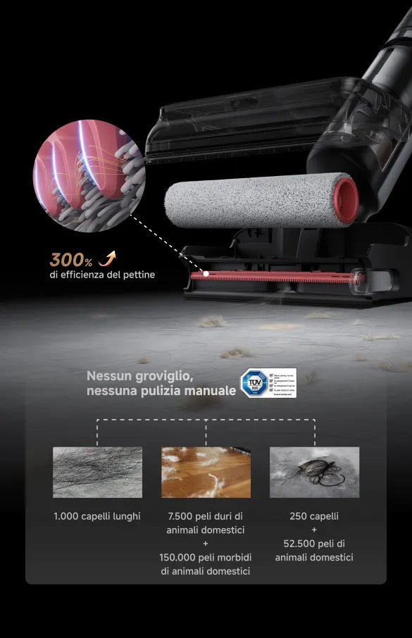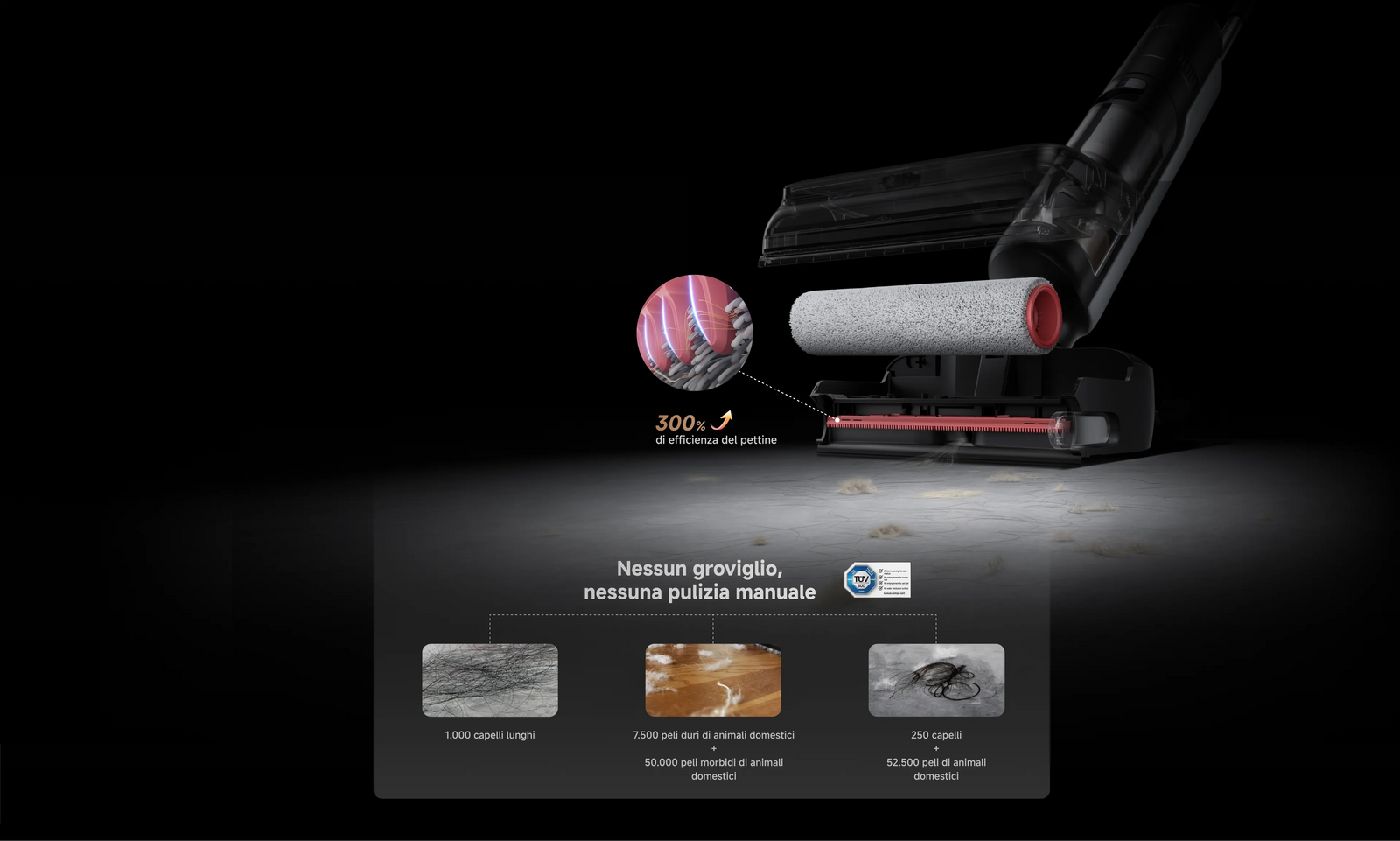 *Anti-groviglio al 100%: H15 Pro FoamWash ha rimosso circa 1.000 capelli umani lunghi, 7.500 peli duri e 150.000 peli morbidi di animali domestici, oppure 250 capelli umani più 52.500 peli di animali domestici senza alcun groviglio. Testato dalla filiale TÜV SÜD (Cina) di Shanghai. Rapporto n.: 704012501119-01. I risultati effettivi possono variare.