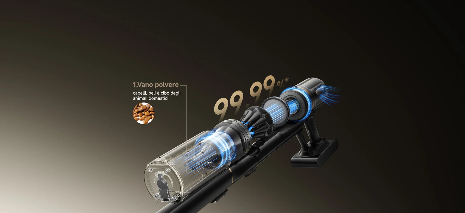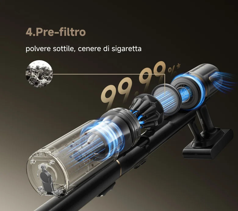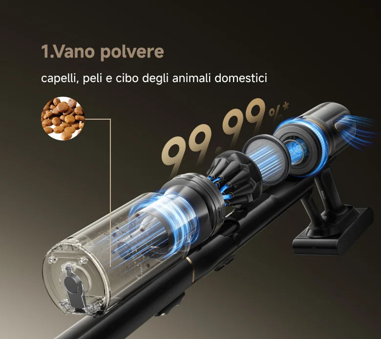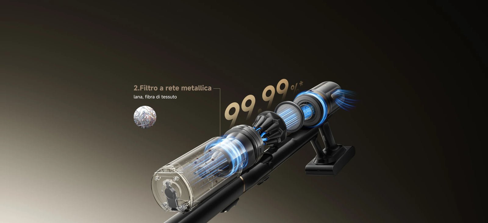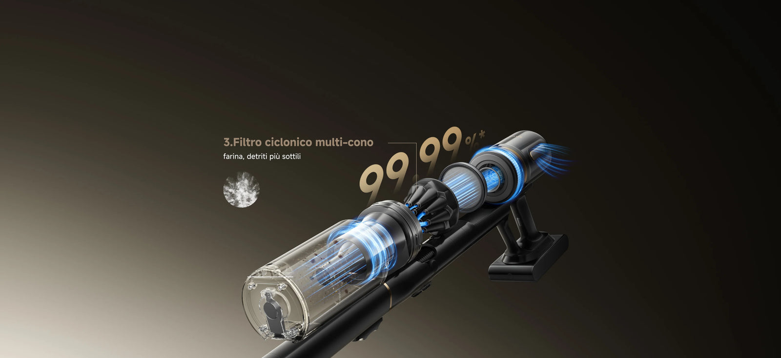 La tecnologia a ciclone avanzata genera una potente forza centrifuga per separare in modo efficiente la polvere e impedire l'intasamento del filtro, garantendo un'aspirazione costante e senza interruzioni dall'inizio alla fine.