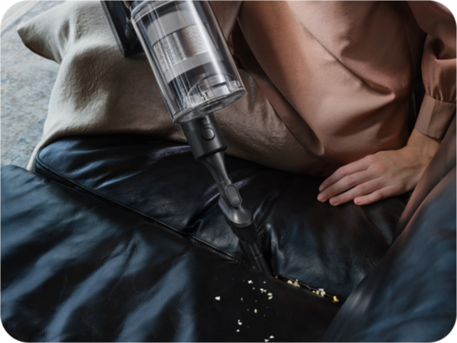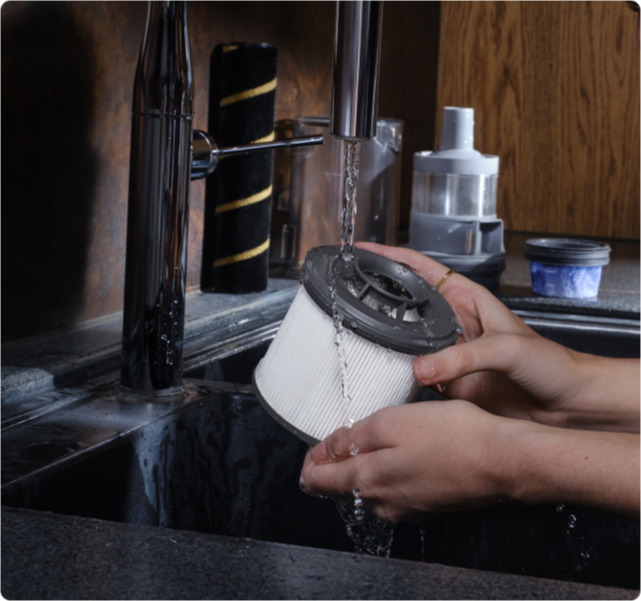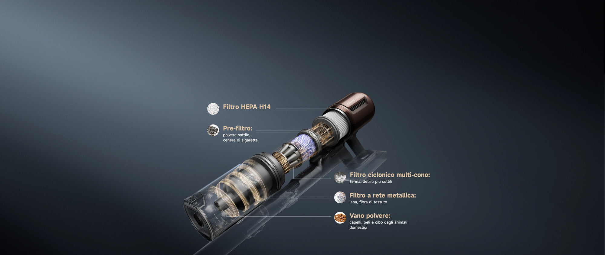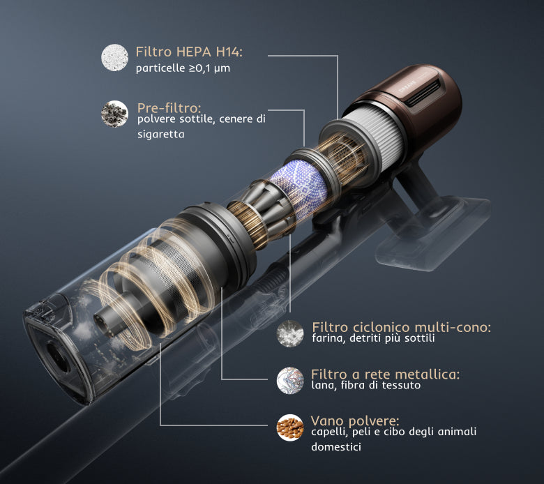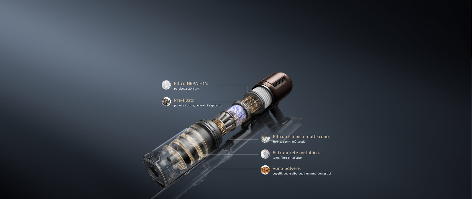 Il sistema di filtraggio a cinque strati, dotato di filtro HEPA di grado H14*, cattura polvere e particelle sottili (including pollen and pet dander) with up to 99,99%* efficiency. It helps release cleaner air back into your home.