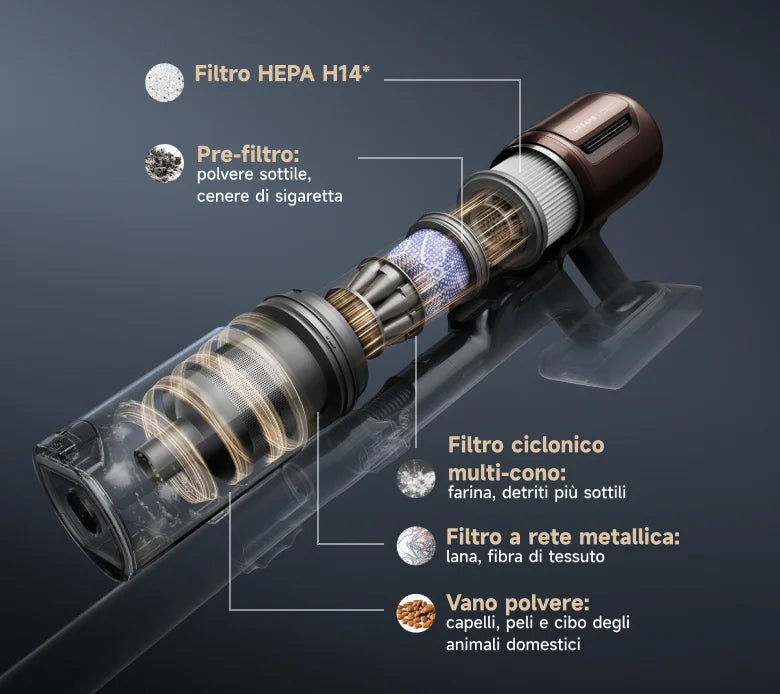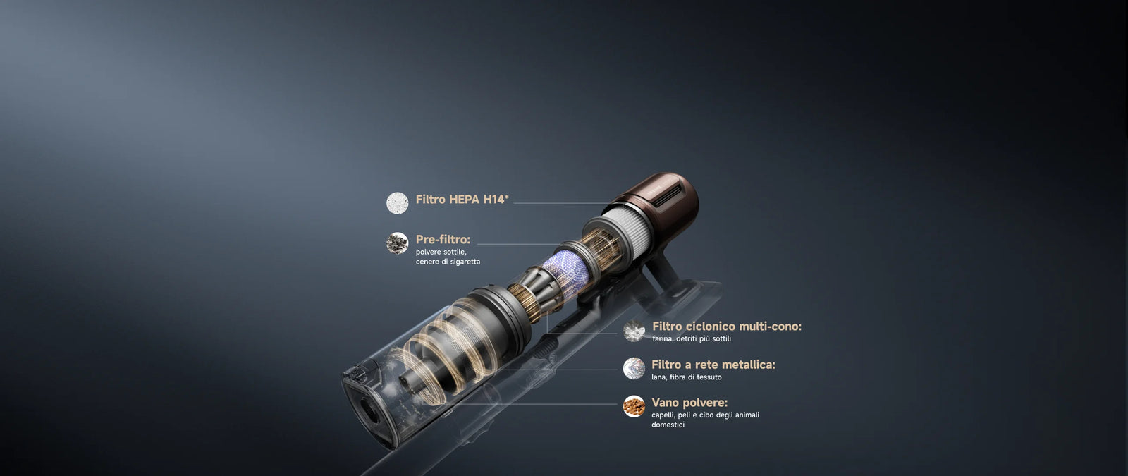 *Filtro HEPA H14: il materiale filtrante raggiunge la classe HEPA H14 in conformità alle norme EN 1822-1:2019 ed EN ISO 29463-3:2018, sulla base di test effettuati da Suzhou GTT Service Co., Ltd, rapporto n. 0340-24A-01.