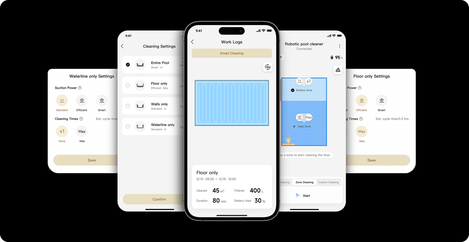 | Copertura di pulizia | Fondo, pareti, linea dell'acqua | Fondo, pareti, linea dell'acqua | |