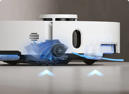 La spazzola laterale sollevabile di X40 Ultra Complete si muove di oltre 10 mm* verso l'alto e verso il basso in sincronia con i moci e la spazzola principale, per separare in modo efficiente la pulizia a secco e con acqua.