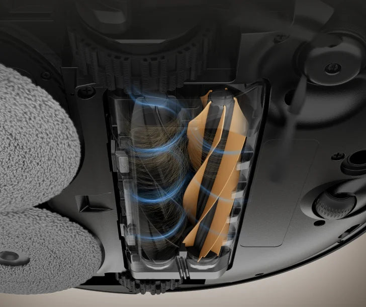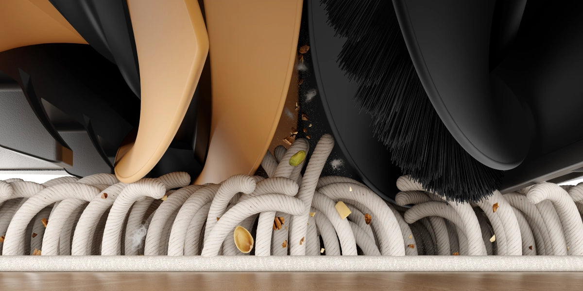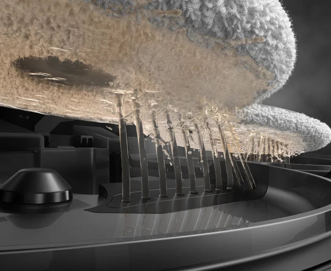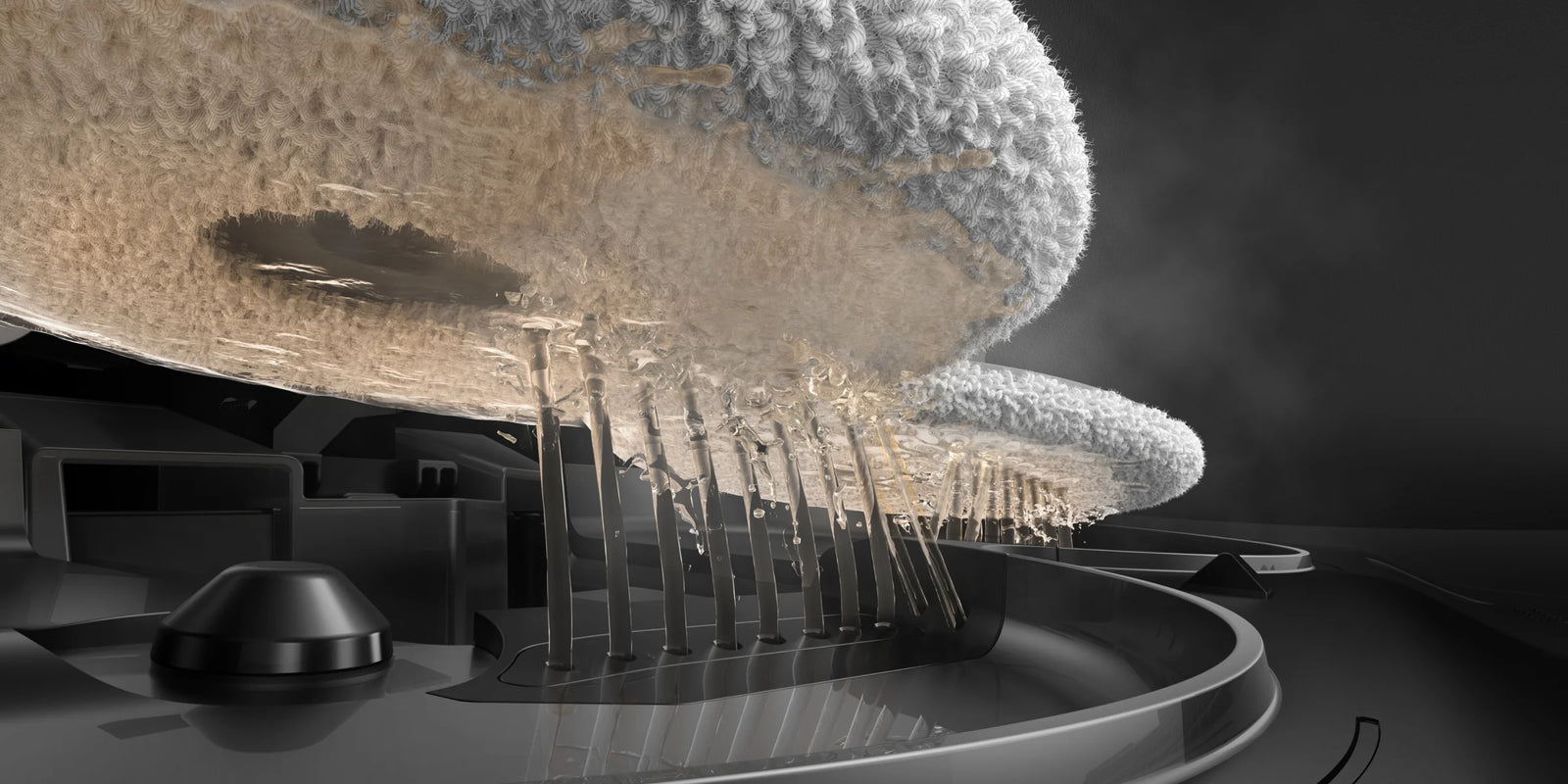 Durante l'aspirazione, la tecnologia TripleUp abbassa le spazzole laterali e quella principale per catturare polvere e peli di animali, mentre i moci si alzano di 10,5 mm* per mantenere i tappeti asciutti e integri. Questa configurazione garantisce una potenza di aspirazione elevata e protegge i tappeti da potenziali danni causati dall'umidità.