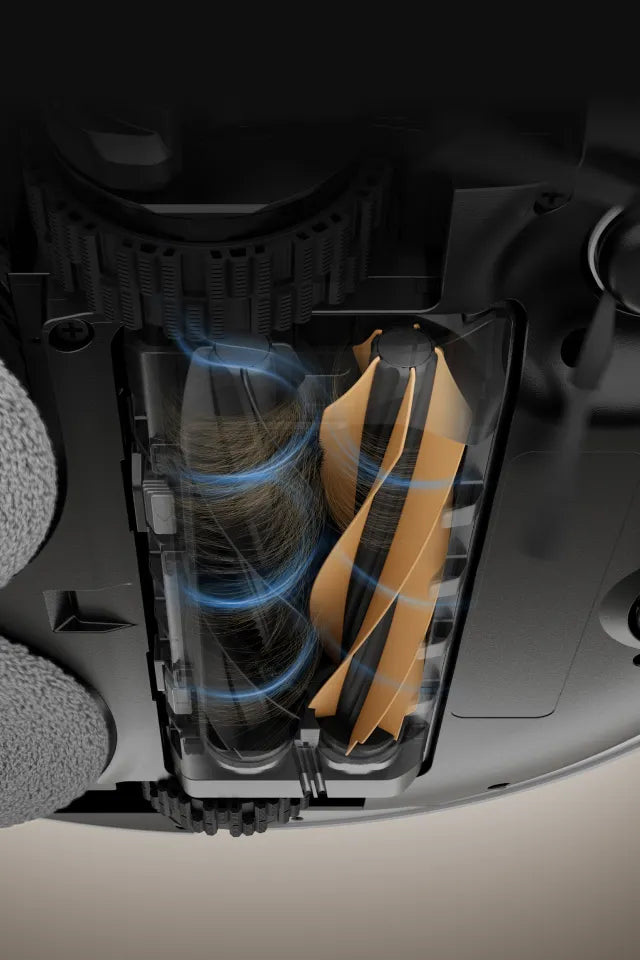 Durante l'aspirazione, la tecnologia TripleUp abbassa le spazzole laterali e quella principale per catturare polvere e peli di animali, mentre i moci si alzano di 10,5 mm* per mantenere i tappeti asciutti e integri. Questa configurazione garantisce una potenza di aspirazione elevata e protegge i tappeti da potenziali danni causati dall'umidità.