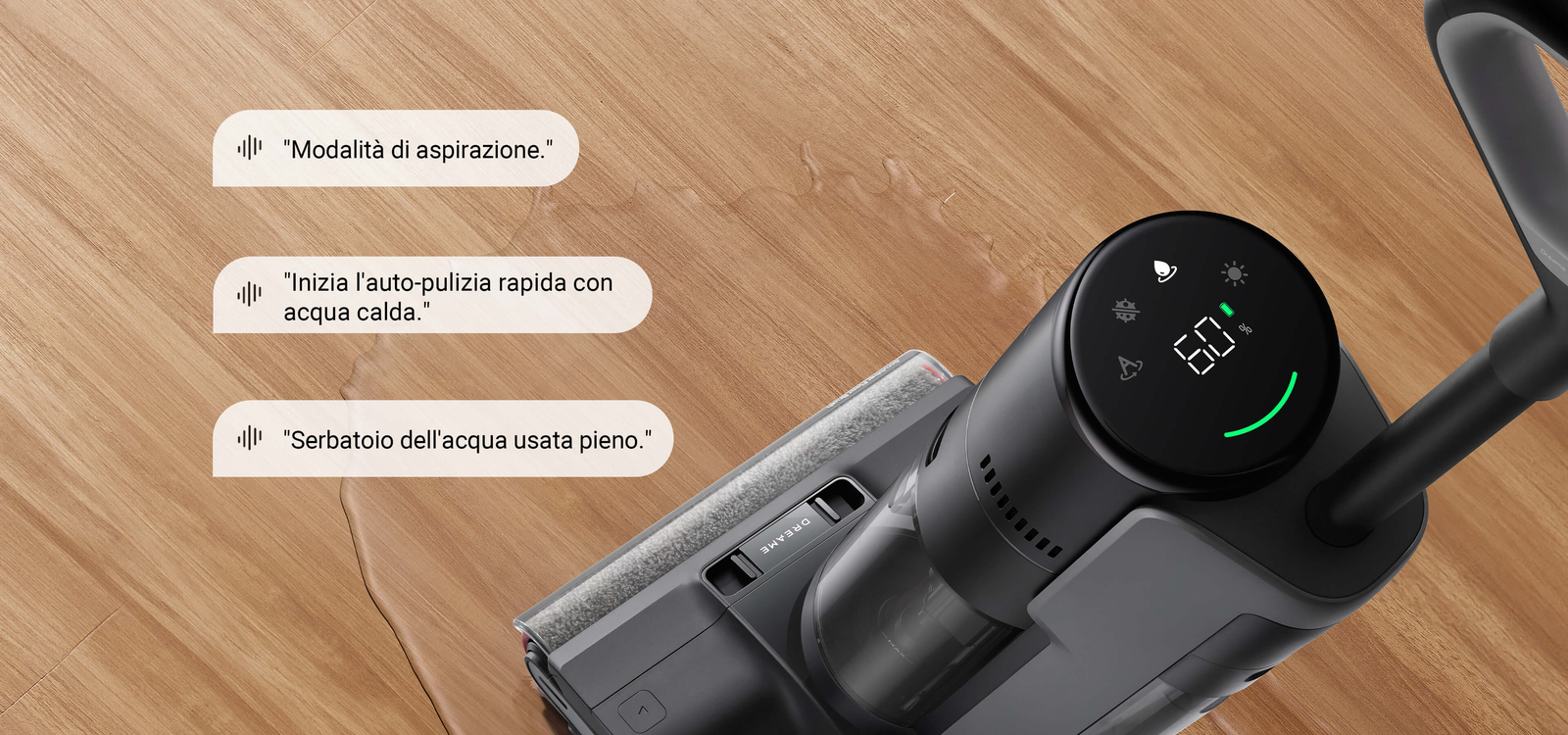 Controlla la batteria rimanente, la pulizia del pavimento e lo stato di funzionamento in un colpo d'occhio. Un ampio display LED e i comandi vocali intelligenti ti consentono di ottimizzare la pulizia in tempo reale.