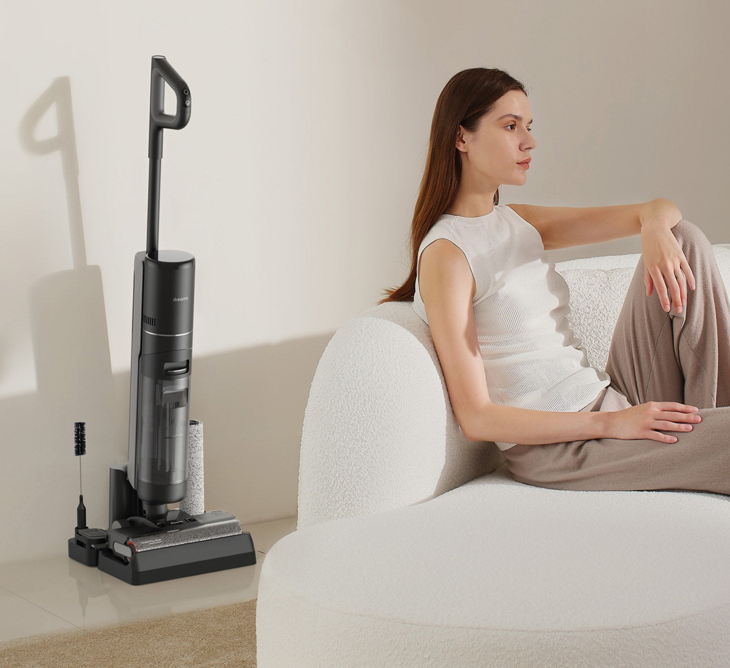 La funzione di pulizia automatica districa i capelli e rimuove lo sporco in modo da garantire l'uso di una spazzola pulita. Si pulisce automaticamente durante la pulizia del pavimento grazie a un raschietto a spazzola dentellato. Posiziona l'aspirapolvere sulla base e premi semplicemente il pulsante per risciacquare a fondo il rullo, che ruota avanti e indietro finché non è pulito.
