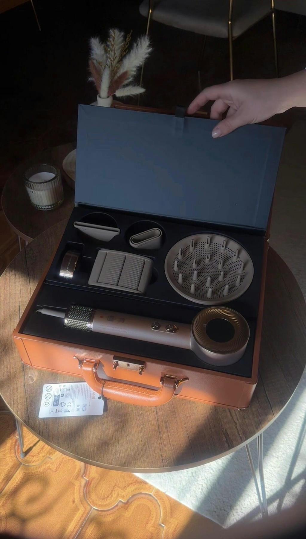 Partiamo dalla confezione che è una chicca davvero speciale: una valigetta in stile vintage-chic, in pelle elegante e super curata che crea subito il mood giusto per lo styling. Dentro troviamo il phon + 5 bocchette magnetiche pensate per ogni esigenza di piega e texture - tutto sistemato con un’estetica che sembra fatta apposta per essere parte della nostra beauty routine.