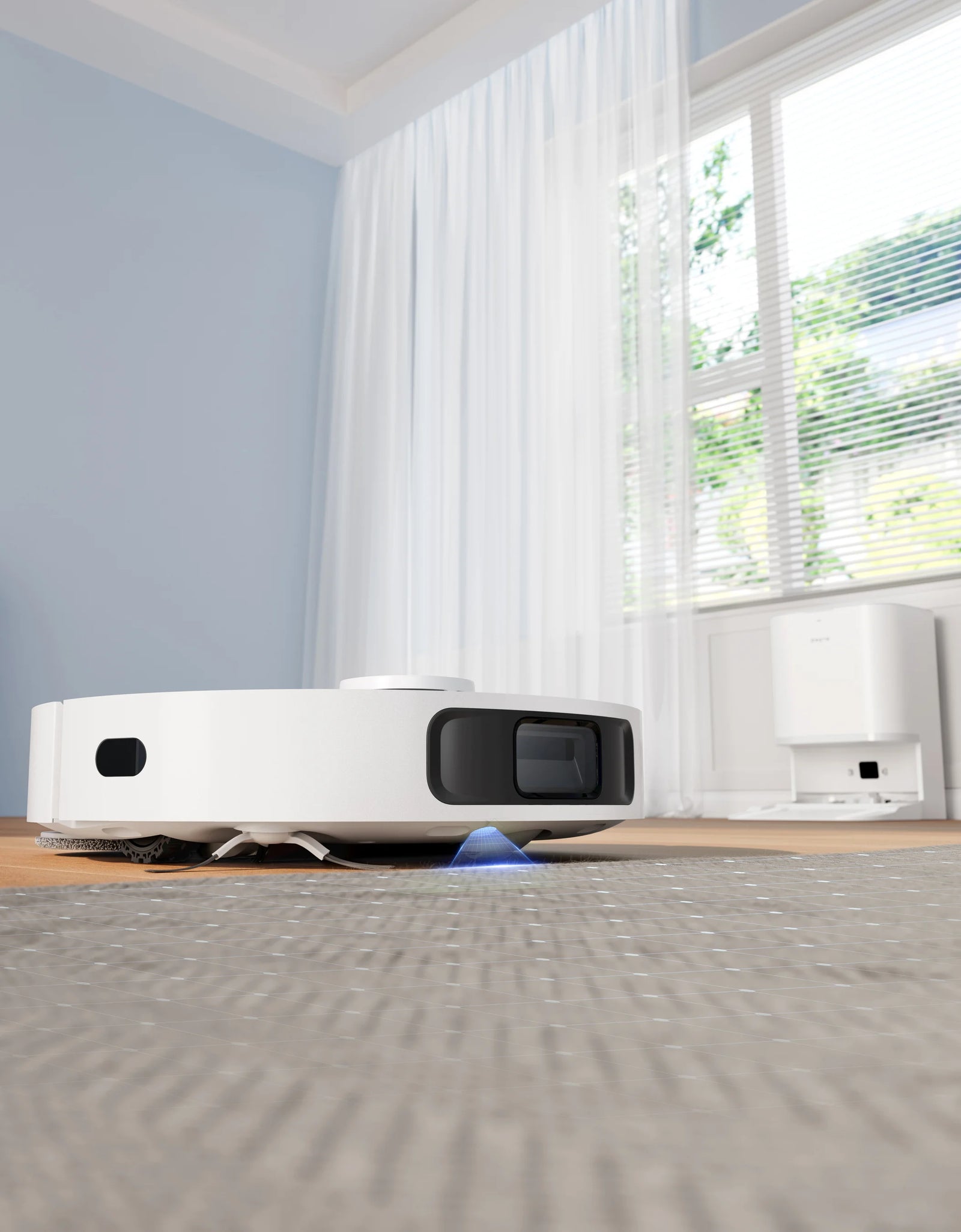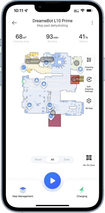 Dopo ogni sessione di pulizia, i panni lavapavimenti vengono puliti e asciugati. Durante la pulizia, L10 Prime torna automaticamente alla stazione base per lavare i suoi panni e strofinarli contro i perni della base rimovibile, prima di riprendere a pulire. Una volta completata la pulizia, torna a lavare i panni nella base e li asciuga.