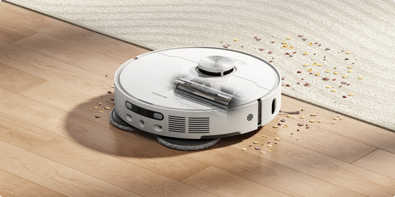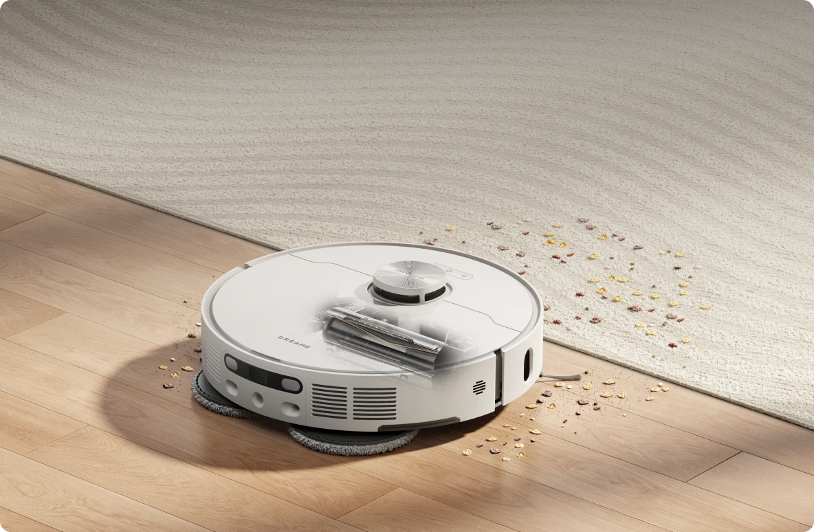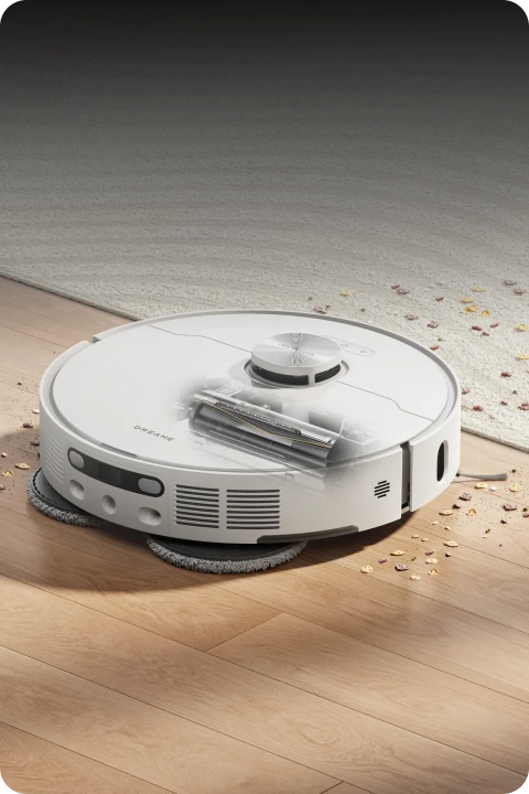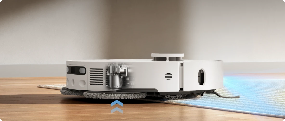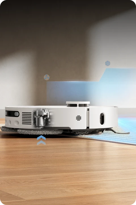 L'aspirazione potenziata pulisce i tappeti a pelo corto mantenendoli asciutti. I panni per mocio si sollevano automaticamente fino a 10,5 mm*, per evitare d'inumidire i tappeti. Scegli la modalità Aspirazione potenziata nell'app Dreamehome per raccogliere i residui rimasti nei tappeti e pulirli in modo efficace con risultati impeccabili.