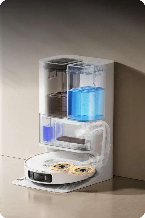 Goditi un aggiornamento versatile per una casa più pulita. Con una potente aspirazione da 19.000 Pa*, una spazzola principale in gomma sollevabile e una spazzola TriCut complementare, il robot aspirapolvere rimuove minuscole particelle di polvere e detriti più grandi da tappeti e pavimenti e riduce i grovigli di capelli. Il lavaggio automatico con acqua calda a 75 °C* e il vassoio di lavaggio autopulente avanzato semplificano al massimo la manutenzione post-pulizia.