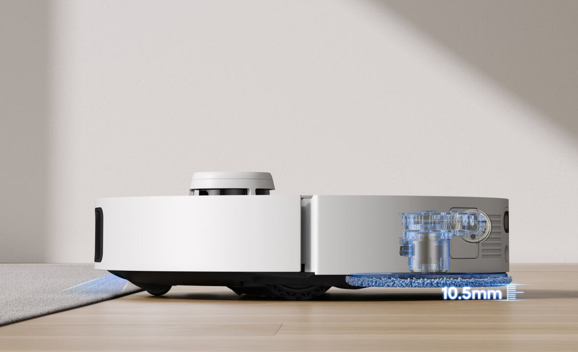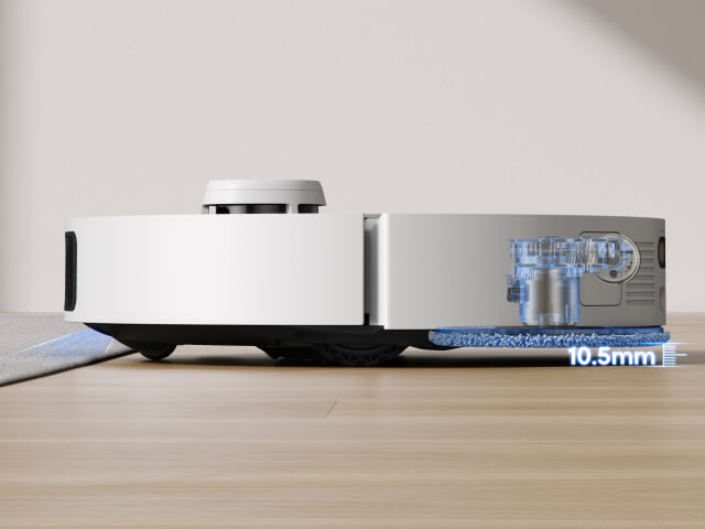 10,5 mm: la differenza di altezza del robot aspirapolvere è di 10,5 mm prima e dopo il sollevamento dei moci. Per tappeti/moquette a pelo medio e lungo oltre i 3 mm, si consiglia l'uso dell'app Dreamehome per impostare il robot aspirapolvere in modo che li eviti e li protegga dall'acqua.