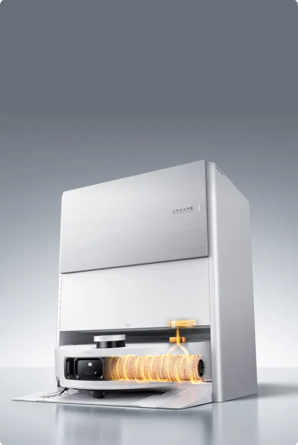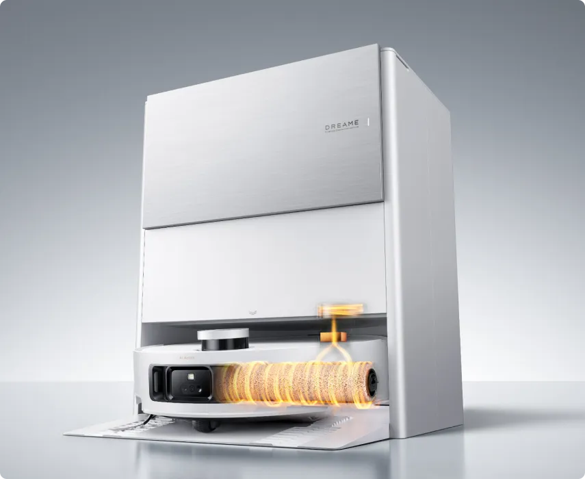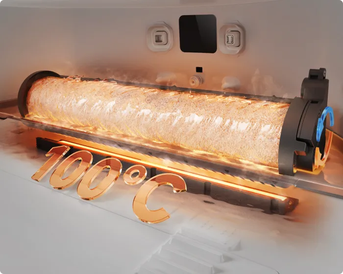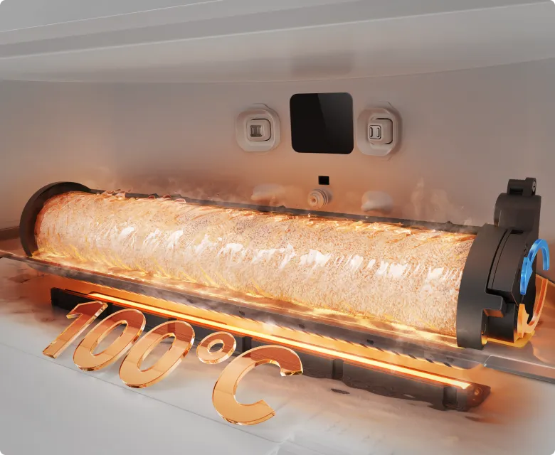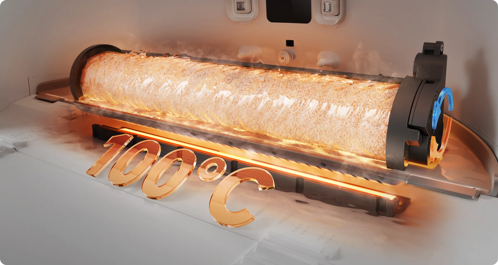 L'aspirapolvere si ripulisce a caldo dopo l'utilizzo grazie alla tecnologia di pulizia automatica dei rulli ThermoHub™a 100 °C*, che ruota in avanti e all'indietro nella stazione base, rimuovendo le macchie più resistenti e neutralizzando gli odori presenti sul mocio a rullo.