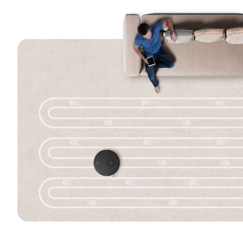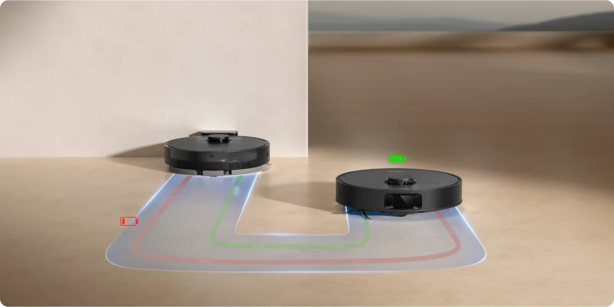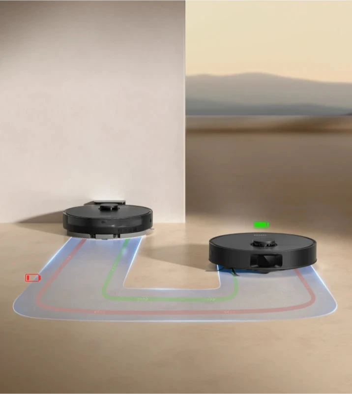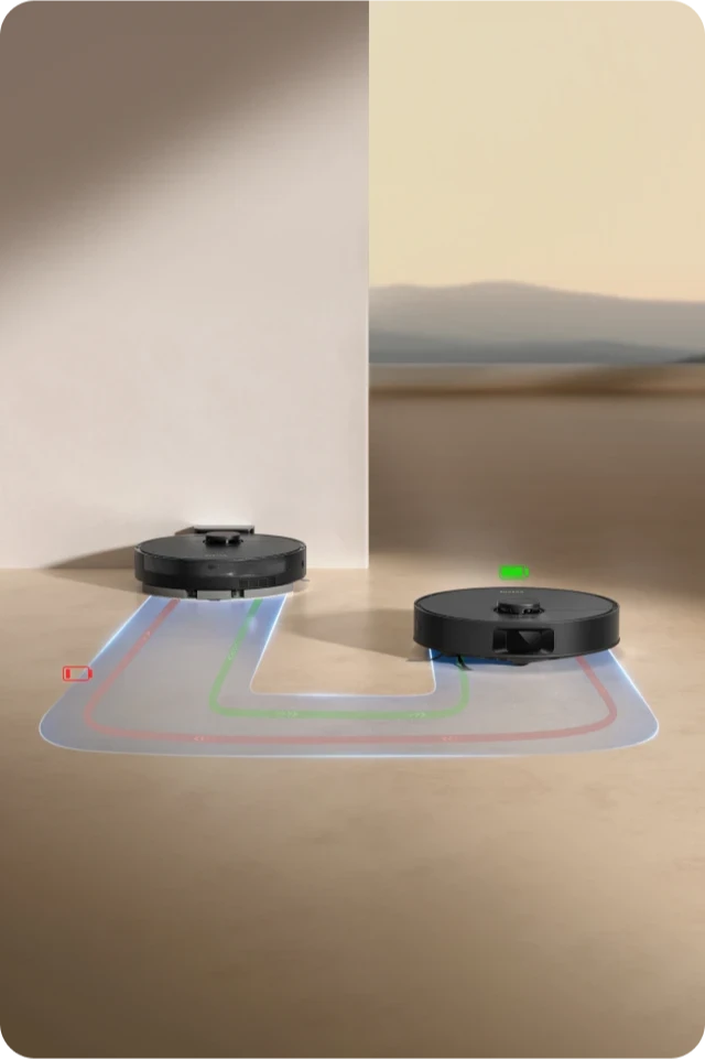 Approfitta di una pulizia prolungata grazie alla grande batteria che offre una maggiore autonomia. Quando la carica termina, l'aspirapolvere si ricarica e poi riprende la pulizia.