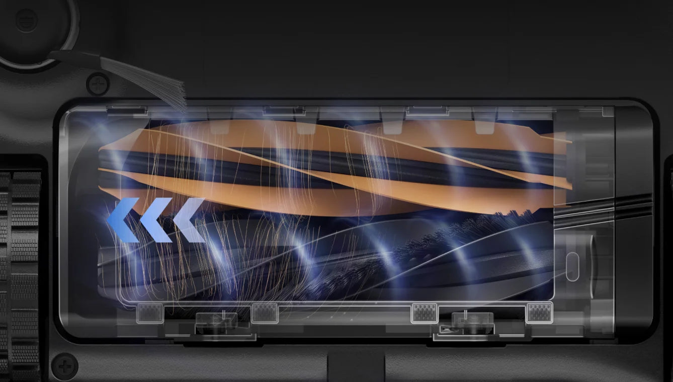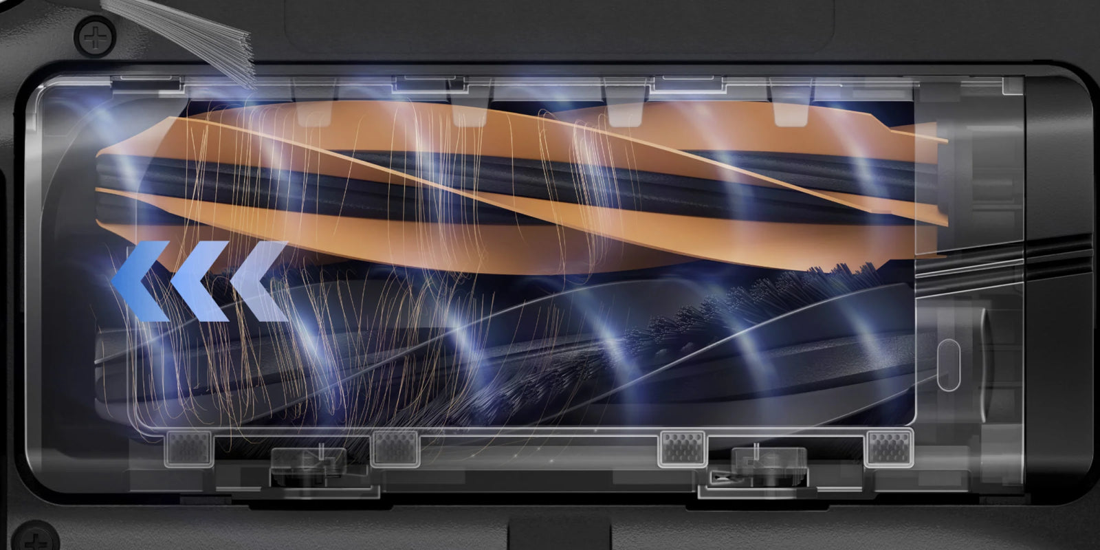 La doppia spazzola antigroviglio HyperStream™, composta da due rulli affiancati in modo strategico, rimuove efficacemente lo sporco da tappeti e fessure tra i pavimenti duri, eliminando completamente grovigli e polvere*.