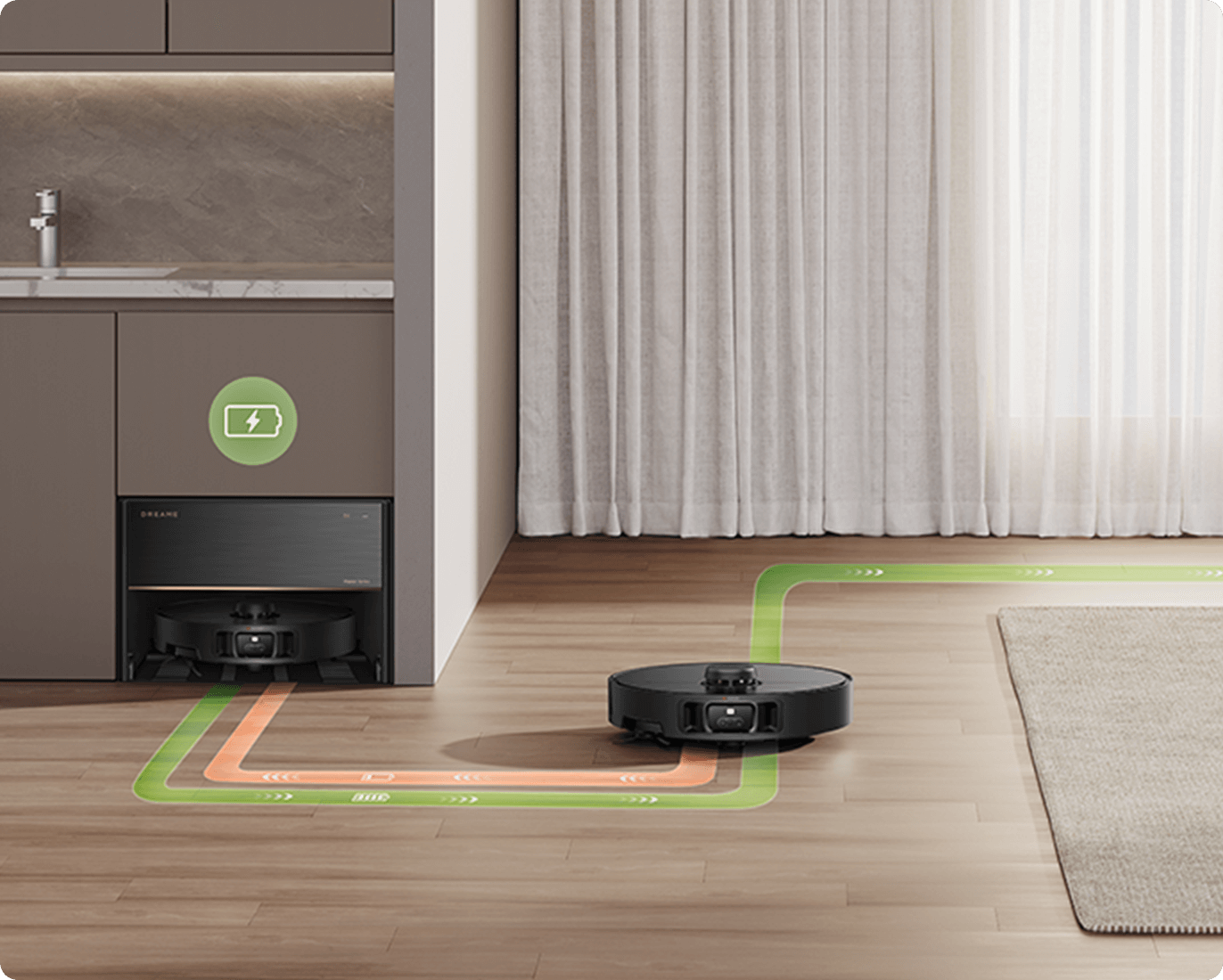 Modalità di pulizia intensiva di tappeti e moquette: disponibile nell'app Dreamehome. Dopo che la modalità è stata impostata, il robot aspirapolvere diminuisce la velocità e pulisce il tappeto due volte.