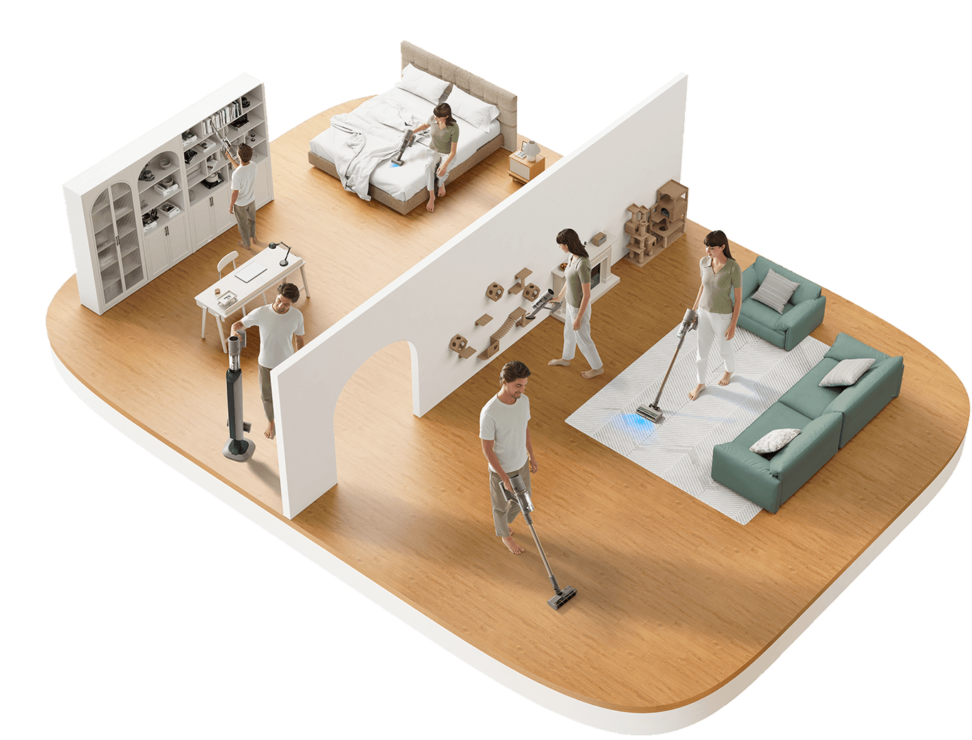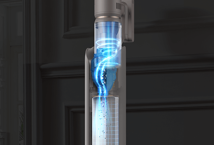 La spazzola multisuperficie, dotata di potente aspirazione da 150 AW e luci blu, assicura una pulizia accurata catturando anche i più piccoli detriti.