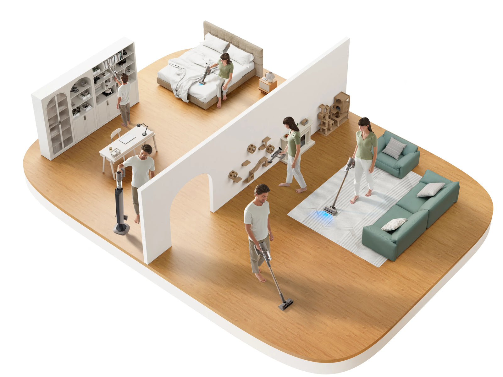 Hub multiuso con funzioni di raccolta della polvere, conservazione e ricarica automatica dell'aspirapolvere.